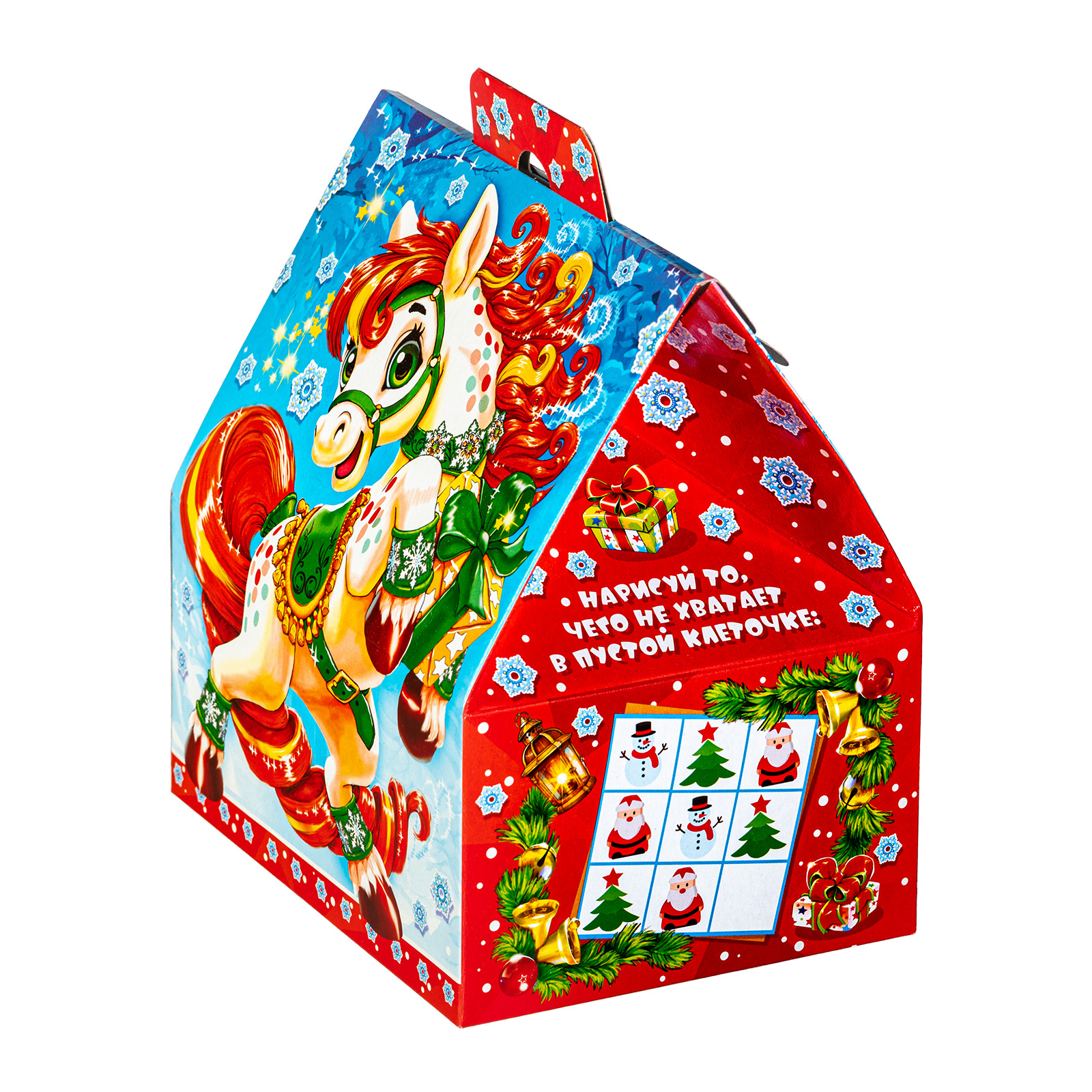 Новогодний сладкий подарок с изображением символа наступающего года - это беспроигрышный вариант под любое праздничное торжество. “Астра” -. это небольшая картонная коробочка с изображением веселой грациозной лошадки. Сверху имеется удобная прорезная ручка, а внутри этой коробки бережно хранятся вкусные и разнообразные сладости. Помимо угощений данный набор содержит небольшой памятный сувенир, а также сбоку есть мини-игра на внимательность и логику. Этот конфетный набор за счет компактных размеров и невысокой стоимости прекрасно подойдет для покупки в школы или детские сады - детки будут в восторге!